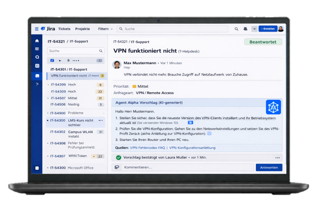 Erleben Sie live, wie Agent Alpha wiederkehrende Fragen automatisiert, Expert:innen gezielt entlastet & dabei eine nachhaltige Wissensbasis aufbaut.